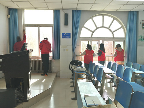 活动开展之前,大家准备好劳动工具,共分为两组分开打扫E201室和E202室。待活动开始后,积极分子们迅速投入到清扫工作之中,拿抹布的同学用力擦除玻璃和桌子上的污垢和涂抹痕迹。旁边的同学积极配合及时为他们更换干净的水。拿拖把的同学也紧跟在了扫完地的同学之后,工作效率极高。正是因为他们分工明确、齐心协力,工作安排的井然有序,活动持续不到一个小时便打扫完毕。最后,积极分子们带走了清除的垃圾,只留下干净而美丽的教室。本次清扫活动圆满结束。