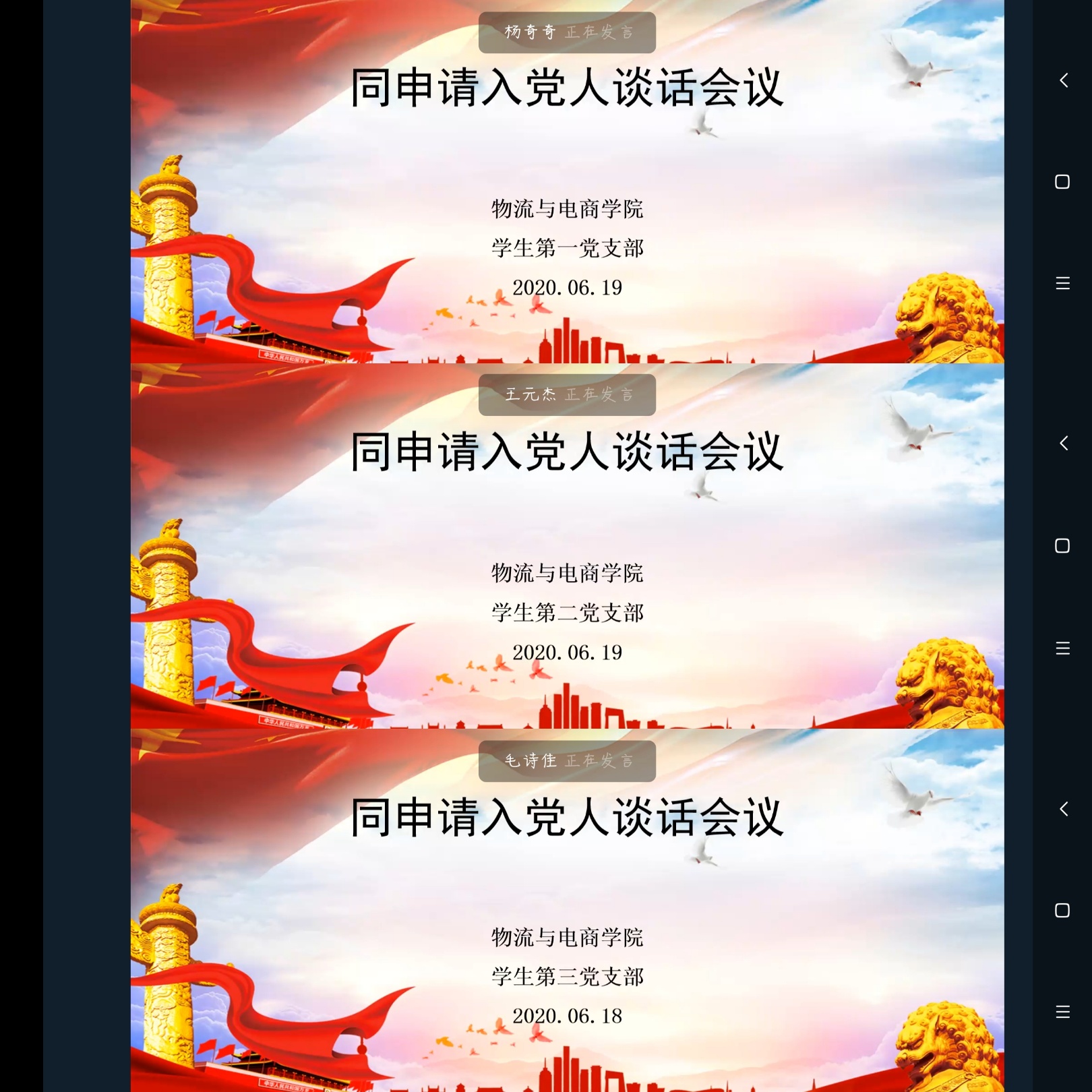 为进一步引导入党申请人端正入党动机、摆正入党态度、明确入党要求与努力方向,6月18日至19日365英国上市公司员工第一、二、三党支部分别于线上钉钉群召开了同入党申请人谈话会议。员工第一、二、三支部书记杨奇奇老师、王元杰老师、胡可鑫老师作为谈话人出席了本次会议,83名向党组织递交入党申请书的同学参加了此次会议。