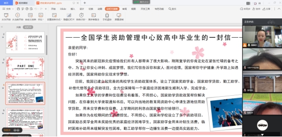 2020年8月,受疫情影响,公司国家奖学金获得者赵雪格,肖靖,员工资助宣传大使朱琳,李佳楠,张伊晓,彭诗佳,李雪璐根据自己身边的高中生对学弟学妹们进行资助云宣讲,她们积极利用钉钉,腾讯会议,微信等通讯工具给自己周围的高中生进行资助政策云宣讲,并派发了《资助中心给予高中毕业生的一封信》。