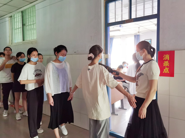 诚信考试教育会后,考生们分两组进行了“无声入场”模拟演练活动。考生在教室外排队,逐一接受老师的金属探测器检查,无报警声响方可顺利进入教室。遇到探测器报警的考生,需立即回宿舍更换衣物,再来检查,直至探测器无报警声响,才可通过。