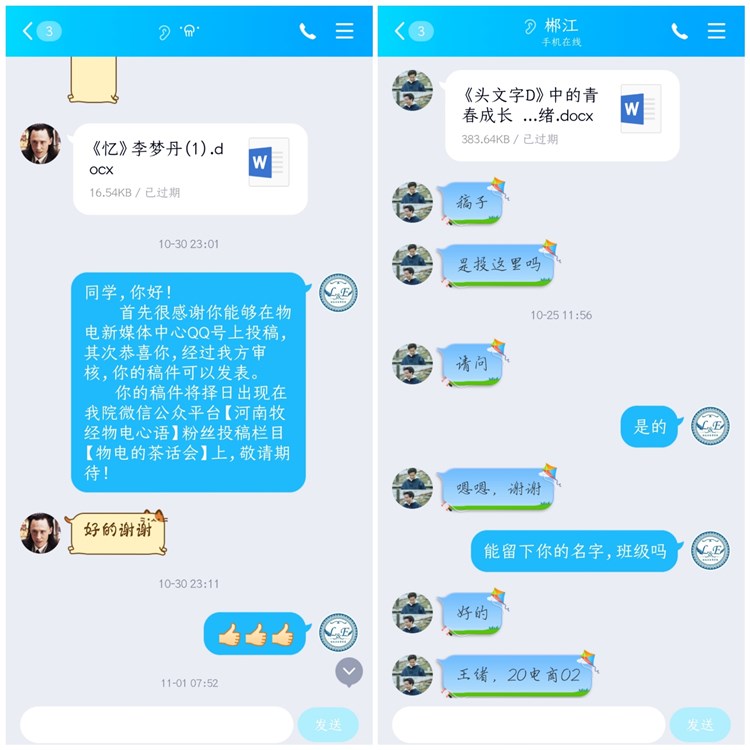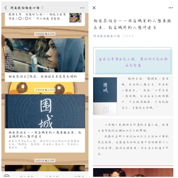 专栏投稿的作品内容积极向上,同学们也乐在其中。大家纷纷借此机会分享自己在大学的喜怒哀乐,记录在大学的酸甜苦辣,阐述自己所喜爱的一部电影、一篇美文、一本书籍、一种美食、一段诗词,讲述内心独白,文章犹如溪水,泉源丰盈。活动前期,公司员工以个人为单位以文件的形式发送至公司QQ进行投稿,由新闻部成员进行收取。稿件收取完毕后,由新闻部成员对所有稿件进行筛选和留存,并将审核通过的优秀作品展示在公司微信公众号“河南牧经物电心语”的《物电茶话会》专栏中。