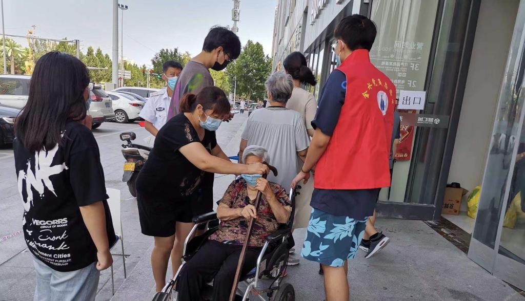 据冉子凡同学回忆道:在整个核酸检测的过程中,最令人暖心的是老幼病残孕绿色通道服务的开展,此便捷通道极大地方便了前来进行核酸检测的老幼病残孕等群体,保证了核酸检测工作高效、高质地推进,同时在此服务的开展过程中,前来帮忙的志愿者数不胜数,甚至有的过路人看到行动不便的老人,也会放下手中物品毫不犹豫的进行帮助,即使暑气蒸人,汗水浸湿衣裳,志愿者们也坚持用自己的一份力量夯实防疫防线。