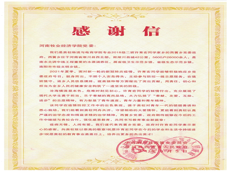 感谢信言辞恳切,让我们看到了许育宏同学的勇担使命和无私奉献,也让我们看到了西簧乡党委政府对家乡有这样的年轻人才的骄傲,还让我们看到了西簧乡党委政府对培育家乡人才的公司的感谢。“青年强则国强,青年富则国富”,此次疫情防控期间,涌现的青年力量令人动容。公司学子积极参加志愿活动,正是有担当、有责任的体现,也是公司优良院风的体现。
