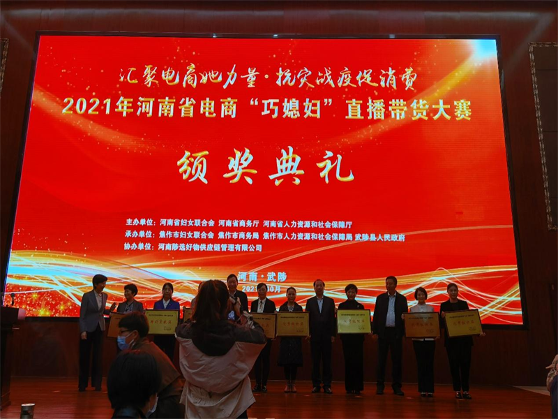 下午,曹献存经理出席河南省电商“巧媳妇”直播带货大赛颁奖仪式。此次大赛为来自全省17个地市和济源示范区的巾帼主播带头人提供了在电商新零售行业展示风采的机会,比赛最终评选出一、二、三等奖及优秀组织奖。