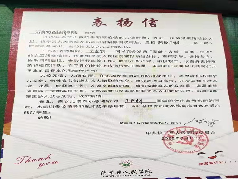2022年春节,新冠肺炎疫情再次袭来。为有效遏制疫情扩散,寒假期间,公司21级物流工程专业01班的王世科同学响应社区号召,积极参与抗疫志愿者活动,自愿加入到“镇平县人民医院”的防疫工作中。3月29日,公司收到来自南阳市镇平县人民医院的感谢信,并对王世科同学为抗疫做出的贡献表示感谢。
