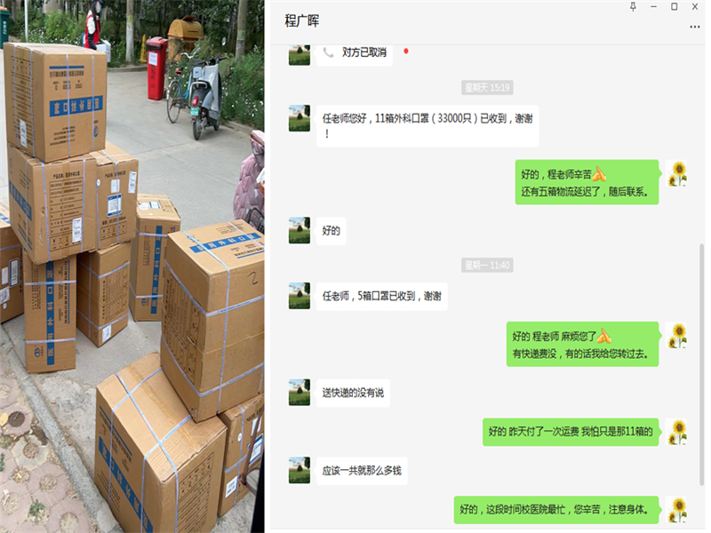 在得知公司防控物资消耗巨大,物资紧张的情况下,任佳佳老师和妻子张朦朦老师多方联系,第一时间购买16箱共计4.8万支口罩捐赠给公司,用爱心为公司筑牢疫情防控战线贡献力量。