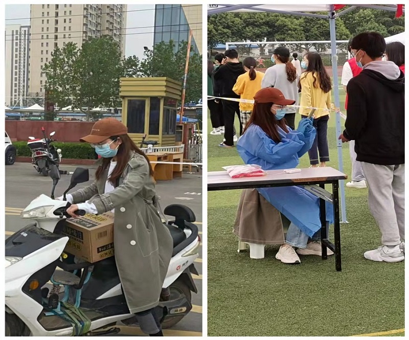 物资难求,箱箱珍贵。当防疫物资抵达公司后,公司立即组织在校教师搬运货物。杨老师变身“配送员”,骑着电动车主动帮助员工搬运配送物资进宿舍,用不太宽厚的肩膀撑起属于自己的责任和担当。杨老师化身核酸扫码志愿者,认真完成核酸扫码工作,协助医护人员做好核酸采样工作。用心用情、无怨无悔担负起公司在特殊时期的特殊职责。