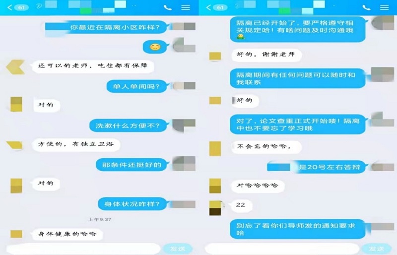 5月5日,员工实习结束从郑州返回安阳滑县,因属地疫情防控要求,须集中隔离14天再返回家中。辅导员杨雪老师知道情况后,第一时间通过电话、QQ等方式与员工沟通,关切地询问了员工目前的身体状况、饮食情况、居住环境等情况,嘱咐员工要严格遵守地方疫情防控要求,以科学的态度正确面对隔离,积极配合医学观察,体现物电人的责任担当。同时,注意居家锻炼,提高身体免疫力,按照要求完成毕业论文,顺利毕业。