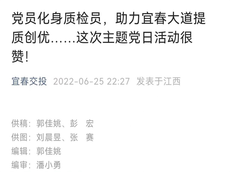 公司20物流管理01的郭佳姚同学暑假在宜春交通投资集团有限公司实习,在岗期间,主要负责公司微信公众号运营、网站运营等,收集投稿并将其编辑后发布,有时候也会参与写稿,在工作过程中,积极学习相关知识,不断提高自身的综合素质。郭佳姚同学表示,在信息宣传岗工作日子,虽然工作很忙,但是非常很高兴能够得到大家的认可,同时也认识到了信息宣传工作的意义。