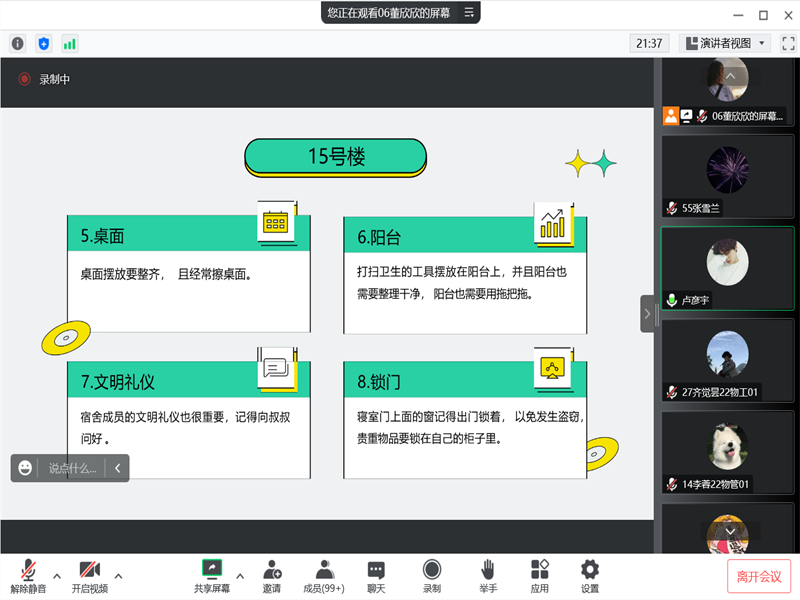 为了更好地帮助新生适应崭新的老员工活,养成良好的作风习惯,宣扬公司优秀的校风校纪,365英国上市公司于9月22日晚19时以线上的方式举办了“校规校纪教育及宿舍内务讲解”主题班会活动,全体22级新生参加了此次会议。