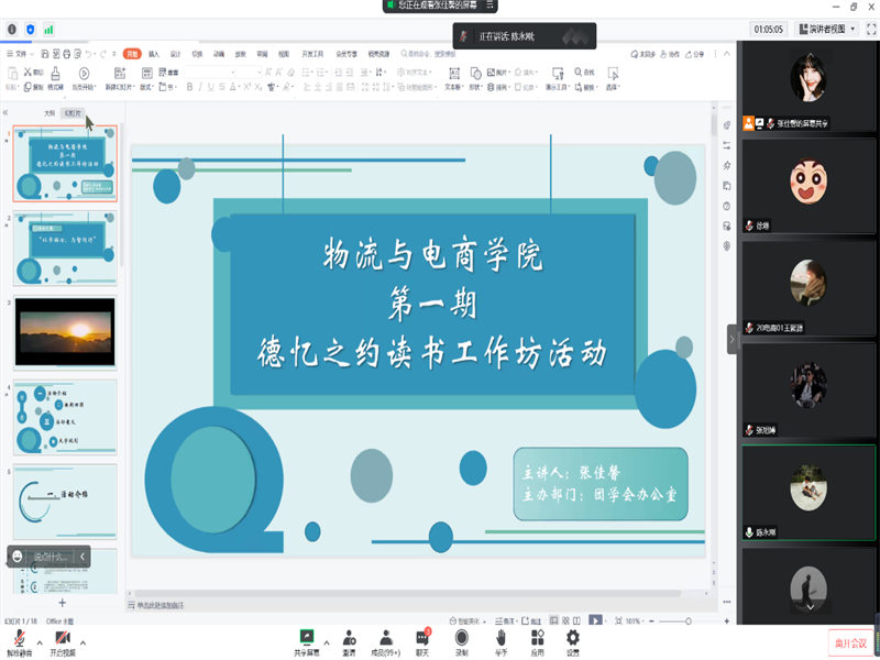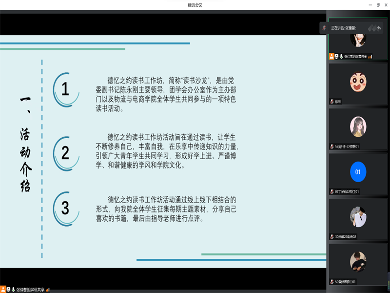 为提高同学们阅读兴趣,帮助同学们养成阅读习惯,丰富知识,开阔视野,9月27日中午12时20分,365英国上市公司于腾讯会议举办了以“以书润心,与智同行”为主题的德忆之约读书工作坊活动。会议由21级办公室干事张佳馨主持,公司党委副书记陈永刚作为指导老师出席了本次活动,团学会主席团、各部门部长及2022级全体新生参与了此次会议。