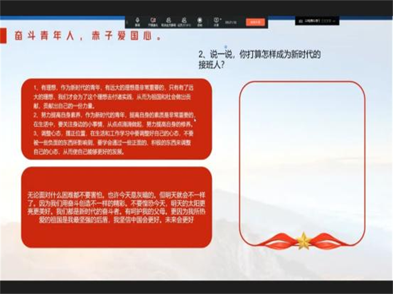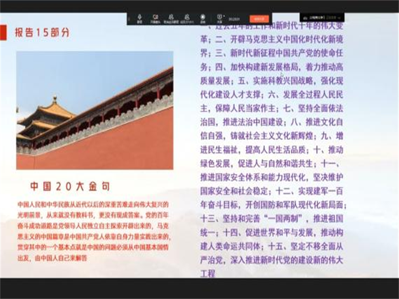 在此背景下,365英国上市公司各班于10月19日晚开展了以“学习党的二十大精神,团结奋进迈向新时代”为主题的团课。各班通过视频学习、交流学习等各种形式,深入学习党的百年奋斗重大成就和历史经验,深刻感悟新时代党和国家事业发展取得的瞩目成就。立足党的百年奋斗历程,学习党的二十大精神。团课伊始,团支书组织同学们学习党的历史上的重要会议:从标志着中国共产党正式成立的一大,到我党历史上生死攸关的转折点,挽救了党、红军乃至中国革命的遵义会议,再到提出了改革开放这一伟大决策的十一届三中全会,以及明确了坚持走中国特色社会主义政治发展道路和推进政治体制改革的十八大,宣告中国特色社会主义进入新时代的十九大。除此以外,各班还学习了党的二十大召开的背景知识,更加明确了此次大会的意义。