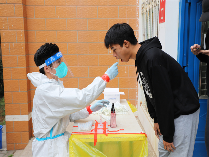 在核酸检测地、餐厅、超市、澡堂及教学楼、宿舍楼等地方,随处可见志愿者们忙碌的身影,他们身穿红马甲深入开展志愿服务,助力疫情防控。在核酸检测地,早上七点,志愿者们就已经到位开始准备工作,摆帐篷,布置场地,帮助医护人员做好核酸检测前的准备,在核酸检测开始后,引导员工主动配合,维持核酸检测现场秩序,帮助提高核酸检测效率。在餐厅、超市门口,志愿者在做好自身防控的同时,提醒同学们正确佩戴口罩,劝说同学们不要聚集逗留,保持距离,时刻秉持扫码可进的原则,同时,在人流量过多时志愿者也会组织同学们排队并控制好距离,按次序进入。在教学楼、澡堂等公共场合进出门口,志愿者会贴心提醒每一位进出的同学时刻戴好口罩,做好疫情防控措施,扫码进出。在宿舍楼进出门口,也会看到志愿者劝导同学们扫场所码、查看扫码信息,然后让同学们进出的场景,整个过程细致认真。同时,本次志愿活动每日分时段轮流,定点换班,在餐厅、超市、澡堂及教学楼、宿舍楼等地方的出入口处执勤,大家各司其职、分工明确,一起保障校园内的疫情防控安全,用责任和担当筑牢疫情防控阻击线,凝聚力量战胜疫情。