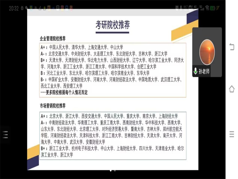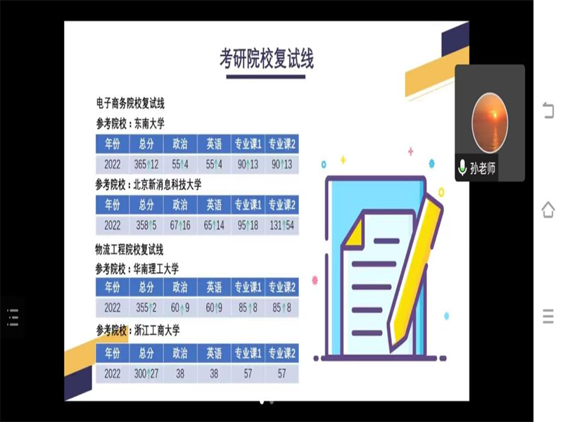 讲座伊始,孙老师根据疫情期间考研人数及录取比例的基本情况对当前考研形势进行举例分析,引入主题。随后孙老师从专业就业前景,学硕/专硕选择,跨专业推荐,考研院校的选择四个方面来为同学们进行考研指导,主要以电子商务与物流管理两个专业来为同学们开展讲解,首先指出两个专业的考研方向,电子商务的考研方向为:国际商务,企业管理,管理科学与工程等;物流管理的考研方向为:管理科学与工程,企业管理,物流工程等。接下来,孙老师向同学们介绍了电子商务和物流管理这两个专业的就业方向与前景,电子商务可以以电子商务网站设计,电子商务平台美术设计等为就业方向,物流管理可以以企业物流,国际物流管理等为就业方向。最后,孙老师结合电子商务和物流管理这两个专业的需求,向同学们推荐了一些不同等级的考研院校。在会议接近尾声的时候,孙老师向同学们全面的讲述了考研的意义和就业前景,激发了公司同学的考研热情,让同学们坚定了考研信心,并向同学们提出了一些考研需具备的要素:科学的备考计划,充足的学习时间,合理的报考方案,要全力以赴,要有针对性。