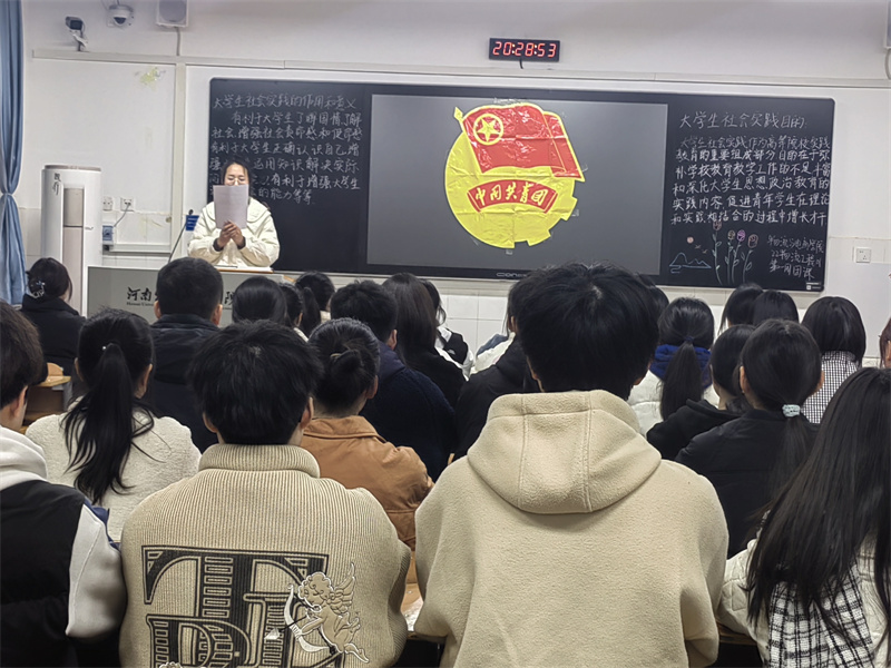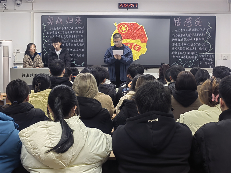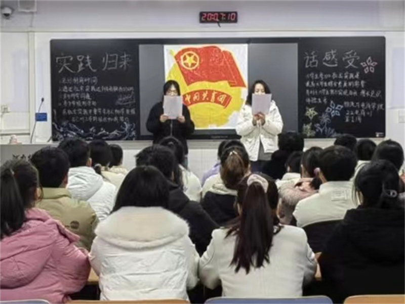 团课伊始,同学们积极发言讲述自己的实践经历。有的同学在家乡参与环境治理工作;有的同学在村支部担任起了基层助理;还有同学帮助本地新建的图书馆整理书籍和书架。随后,同学们在班级中对此进行评价并评选出优秀事迹。团课最后,团支书带领同学们一起宣誓,誓词流露出了同学们助力家乡建设的决心和对未来的期望。