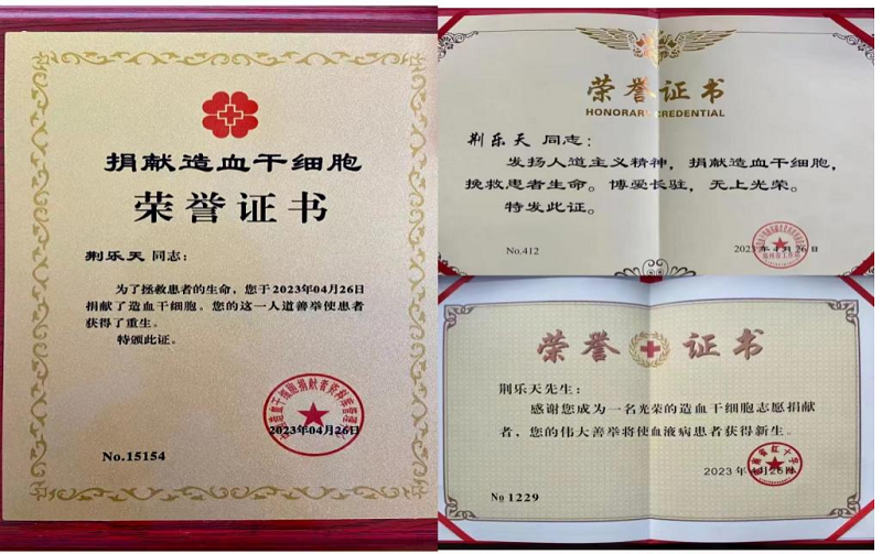 荆乐天同学自2021年6月11日开始了无偿献血之路,在郑州市二七区大学路献血屋,成功完成了自己人生中第一次无偿献血,并加入了中华人民共和国造血干细胞捐献者资料库,至今,荆乐天同学已经先后完成了四次无偿献血。2023年2月27日,一通来自郑州市红十字会的电话,荆乐天同学的HLA分型资料与一名白血病患者初步相合,他深知,配型成功的概率只有万分之一甚至几十万分之一,这几乎是受捐者延续生命“唯一的机会”。他毅然决然同意了捐献。在做出捐献决定后,荆乐天告知父母自己的决定,父母表示大力支持,在捐献期间,一直陪同在他的身边。