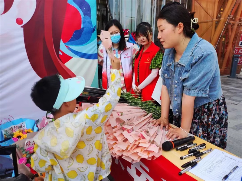 活动开始,志愿者在场地前组织参与活动的人员进行签到。随后,志愿者让参与活动的人员在母亲节主题展板上写下对母亲充满爱意的祝愿并且给予参与活动的人员鲜花以及围裙,让其送给自己的妈妈。接着,有四位志愿者身穿青蛙玩偶服,在美景万科广场内外宣传母亲节主题活动,吸引了很多小朋友前来围观拍照。身穿青蛙玩偶服的志愿者与小朋友积极互动,一同玩耍,在起到宣传作用的同时,也给活动现场增添了欢乐。