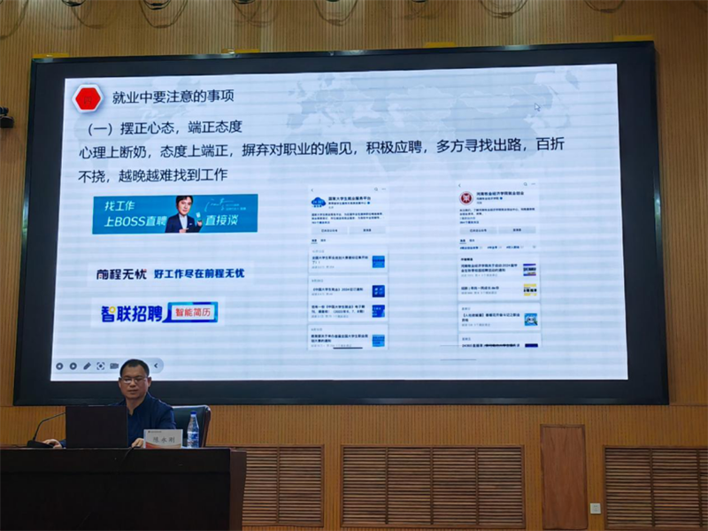 会议伊始,陈书记向我们简要讲述了我国当前的就业形势,当前毕业生就业压力仍然较高,经济形势下行带来的企业岗位需求减少以及就业结构失衡。随后,陈书记提到在和同学们日常交流中反映出同学们的就业观念存在些许问题,例如还有相当一部分人迷茫彷徨,不知道心中的目标追求,以及目光不够长远,没有足够精彩的经历充实自己的简历等问题。针对以上问题,陈书记向同学们提供了一些就业方向的选择。陈书记提出大家可以选择考公、考研,但这与就业并不冲突。机会总是留给有准备的人,基层项目中的三支一扶、西部计划、特岗教师以及应征入伍也是同学们不错的选择。电子商务专业的同学可以选择各类企事业单位、政府机关及有关部门从事电子商务运营与管理等,物流管理专业同学可以选择政府管理部门、现代物流企业、外贸公司等。物流工程专业同学可以选择物流企业、制造企业等。最后,陈书记希望同学们在就业过程中可以摆正心态,端正态度,做好职业规划,树立终身学习观念,不断提高自身竞争力,积极利用各种社会关系,做好个人简历。