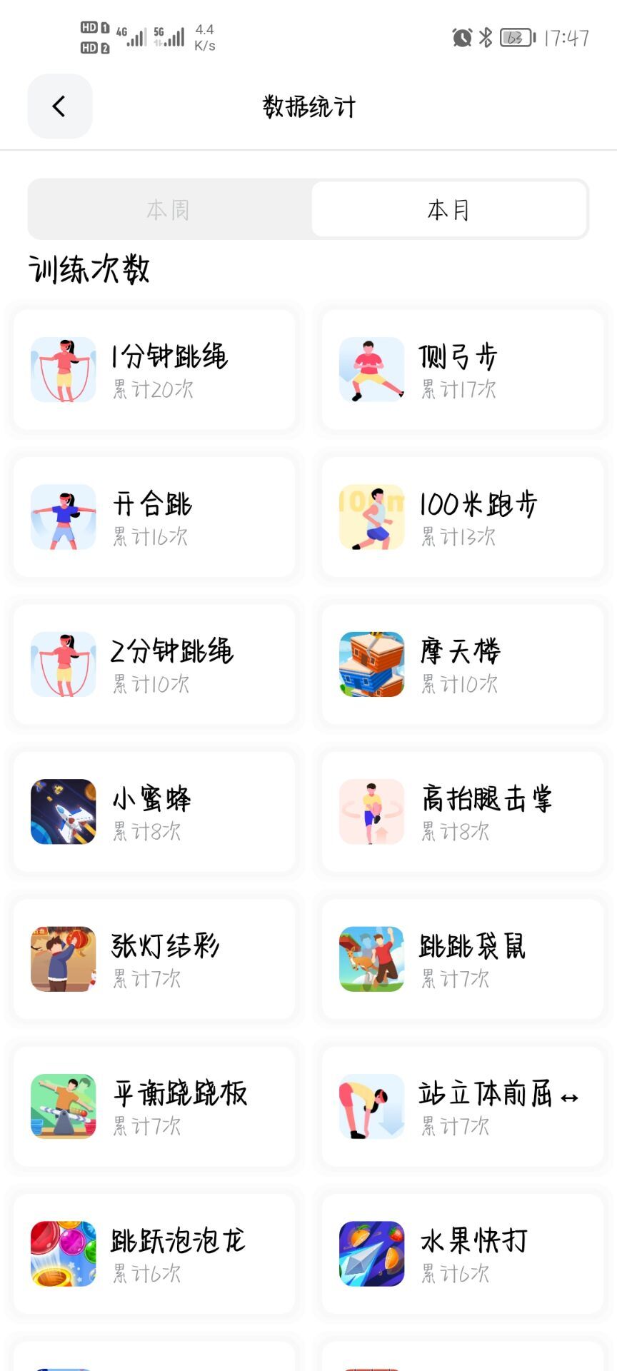 运动不仅可以加快人们的新陈代谢,还可以增强人们的体质,提高抵抗力。疫情期间,加强自身抵抗力尤为重要,因此“疫”起运动活动可以与社会各界一起共同战“疫”,为减少疫情的传播贡献自己的力量。同学们根据活动要求下载“天天跳绳app”,根据老师发布的作业进行训练,其中不仅有传统运动例如:100米跑步、开合跳、跳绳、高抬腿等;也有各种趣运动例如:跳跃泡泡龙、打砖块、水果快打、小飞猪等。这种不同于平常锻炼方式可以吸引同学们参加活动,实现边玩边锻炼。