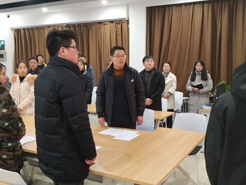 本次活动分为两场均由组织委员韩瑞敏主持。员工第一党支部员工党员发展大会开始后,首先进行的是奏唱国歌,全体与会人员起立以示敬意。接下来,大会讨论了张一、王文博等几名同学的转正问题。首先,各位预备党员在大会上进行了自我情况的说明和汇报;接着杨老师和王老师以及与会同学对各位预备党员做了简单的评价;最后,正式党员举手表决,大会通过了张一、王文博等同学转为正式党员的申请,大家鼓掌对他们表示了热烈的祝贺。接下来,大会讨论了讨论姜琪、吴心怡等几名同学的发展问题。各发展对象进行了入党介绍,经过同学们对各位发展对象进行了入党介绍人评议、互评和辅导员等方面的点评后,与会正式党员举手表决通过了姜琪、吴心怡等同学的申请,大家对此致以诚挚的祝贺,杨老师也发表了重要讲话并对这些同学表示祝贺,鼓励他们不忘初心、再接再厉。最后,全体人员起立,宣读入党誓词,本次活动在铮铮誓言中落下了帷幕。