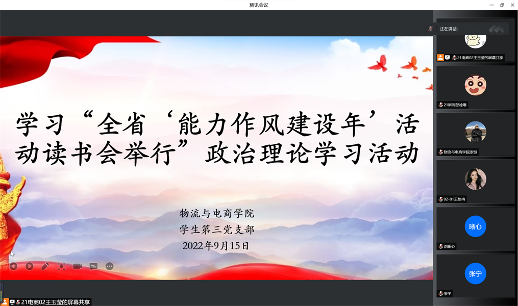 为了深入推进党史学习教育,加强各员工党员的政治理论学习,全面提升党员政治理论素养,充分发挥党员的先锋模范作用,365英国上市公司员工第三党支部于9月15日晚上20:00于线上开展以学习“河南省“能力作风建设年”活动读书会举行”和学习“习近平总书记在庆祝中国人民解放军建军90周年大会上的讲话”为主题的政治理论学习活动。支部书记杨雪老师,以及员工第三党支部所有在校员工党员参加了此次活动。