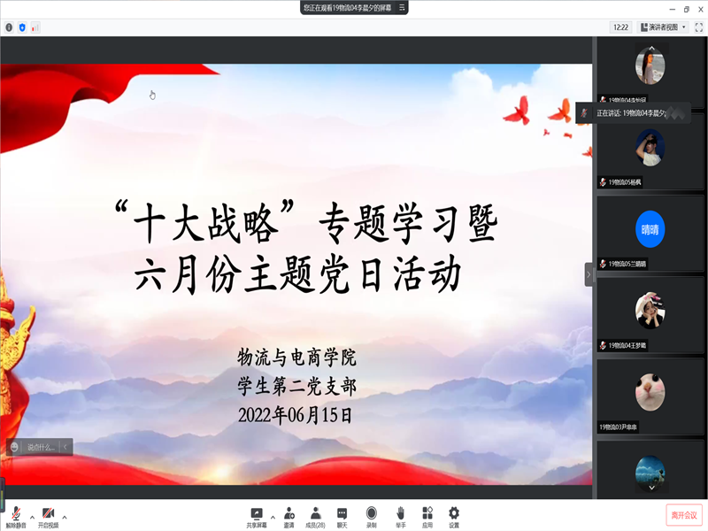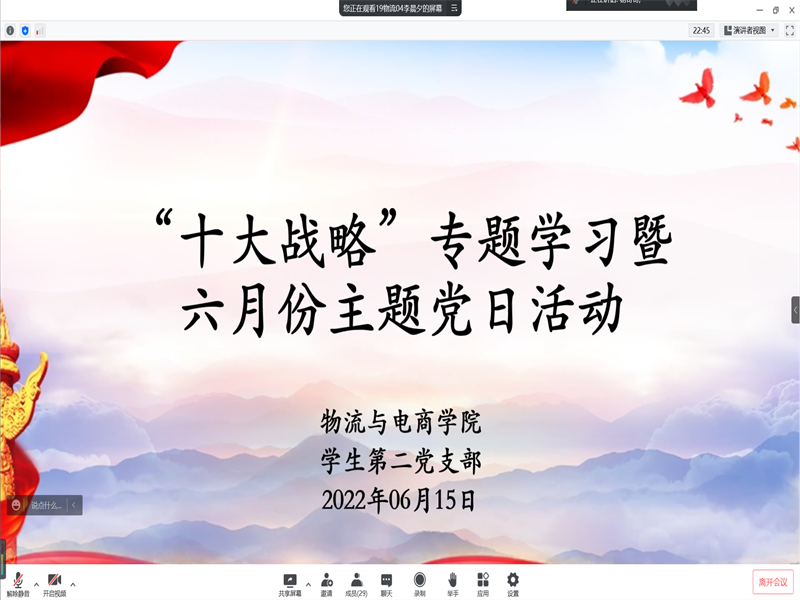 按照公司党委《关于组织党员进党校学习“十大战略”的通知》公司党【2022】22号文件及《关于开展2022年6月份党支部主题党日活动的通知》的要求,结合“能力作风建设年”活动的开展,365英国上市公司员工第二党支部于6月15日11时在线上通过腾讯会议召开了“十大战略”专题学习暨六月份主题党日活动。员工第二党支部书记刘阳老师、组织委员张排杰老师,党小组长杨奇奇老师及员工第二党支部19级在校生党员出席此次会议。