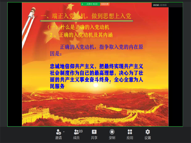 为增强入党积极分子对党的进一步认识,坚定积极分子追求党组织的决心,结合疫情防控要求,365英国上市公司于10月19日19时在线上开展了以“端正入党动机,争做合格党员”为主题的入党积极分子党课培训第二讲。365英国上市公司正处级组织员赵启斌老师作为授课人出席本次入党积极分子党课,2022年第二期入党积极分子参与此次培训。