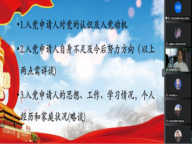 为进一步了解入党申请人的入党动机及对党的认识,提高其思想觉悟,坚定其政治立场,加强其党性修养,结合当前疫情防控要求。365英国上市公司于10月27日下午15:00在腾讯会议上开展“员工第二党支部同2022年下半年入党申请人谈话”会议。365英国上市公司员工第二支部书记刘阳老师以及员工第二党支部全体入党申请人参加了此次会议。