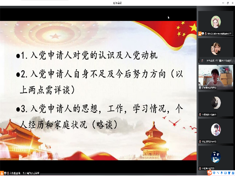 会议伊始,各位入党申请人从对党的认识、入党动机、自身不足及努力方向等方面诠释了自己的入党决心,同时入党申请人们敞开心扉,从个人经历、学习情况以及家庭等方面进行了深刻交流,表明会积极接受党的领导和监督、端正入党动机并时刻进行自我批评的态度,不断从思想上丰富和提高自己。随后,杨老师针对入党申请人的自身不足,建议可以从相关新媒体、下载学习强国等多个平台增强自身的理论知识,丰富人生阅历,提高自身的政治素养。同时,杨老师也从疫情防控方面提出希望大家可以端正思想,积极进行自我调节,努力克服生活中的磕磕绊绊,明确自己的人生目标,既要有“乘风破浪会有时,直挂云帆济沧海”的积极向上,又要有“山重水复疑无路,柳暗花明又一村”的豁然开朗。最后,杨老师引用习近平总书记的话“要励志成为有理想、敢担当、勇作为的新时代青年”来激励全体入党申请人勇当新时代的开拓者、贡献者、奋斗者,努力调整好自身的学习状态,要有坚不可摧的毅力,掌握好自己的时间与节奏,用奋斗来书写属于自己的新时代华丽篇章。