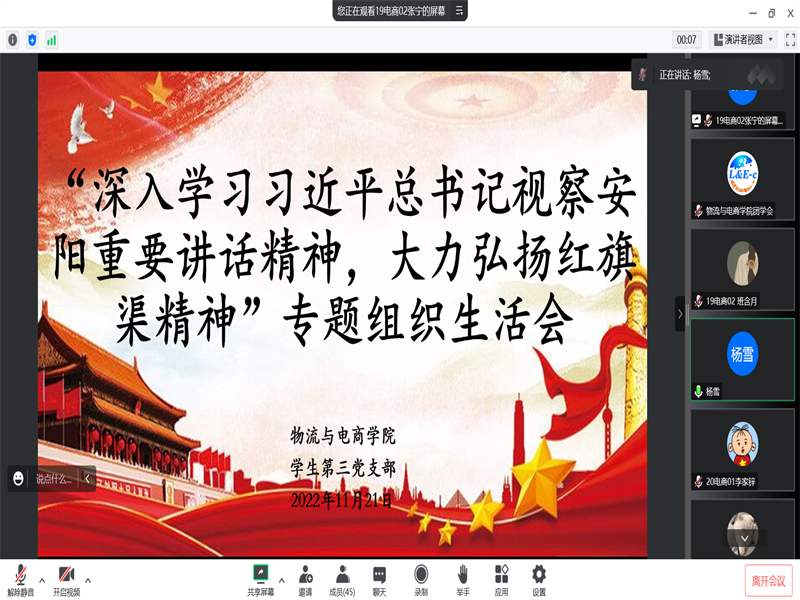 为了深入学习习近平总书记视察安阳重要讲话精神,大力弘扬红旗渠精神。11月21日中午12:20,365英国上市公司员工第三党支部通过腾讯会议在线上开展2022年下半年组织生活会本次会议由宣传委员张宁主持,员工第三党支部书记杨雪老师及员工第三党支部全体在校生党员参加了此次会议。