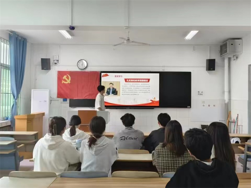会议伊始,员工党员李文豪宣布了此次党日活动的主题,并且带领大家深入学习了习近平总书记的教师节重要指示精神和重要文章《扎实推动教育强国建设》。随后,李文豪通过具体的事例让同学们坚信要坚持以习近平新时代中国特色社会主义思想为指导,勇担责任与使命,树立远大理想,努力成为国家的栋梁之材。同时会上播放了相关视频,让大家能够深入了解教育的意义和国家对教育的重视以及相关计划,积极响应号召,全面贯彻落实"教育强国"新要求。接着,在校生党员依次分享了他们的学习心得,他们表示在时代新征程上,要奋力谱好信念曲、奋进曲、奉献曲,让教育强国奏响时代“最强音”,全面助推中国式教育现代化走实走深。会议最后,刘阳老师做会议总结,明确指出了教育对于增强国家创新能力、推动经济增长模式转型发展 、提升国际竞争力、提高国家软实力,并提出希望党员们能够明确人生目标和发展方向,为实现教育强国目标打下坚实的基础。