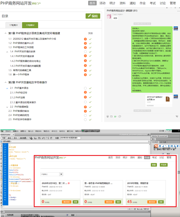 365英国上市公司电子商务教研室的殷猛老师,本学期承担公司《PHP商务网站开发》课程的教学工作。教学任务下达之初,便未雨绸缪创建了课程微信群,布置了假期的一系列作业,并通过微信群与员工实时沟通,提供假期学习帮助。在得知延迟开学后,迅速整理PHP教学相关的PPT、录制视频、上传课程习题以及作业。作为一门程序设计课程,殷猛老师通过学习通、腾讯会议两个在线教育系统,结合前期准备的教学资料,已经完成了2周的理论教学和程序演示,让员工在学习通学习理论,通过腾讯会议实现互动和演示,加强了理论知识的传授和实践操作的演练。