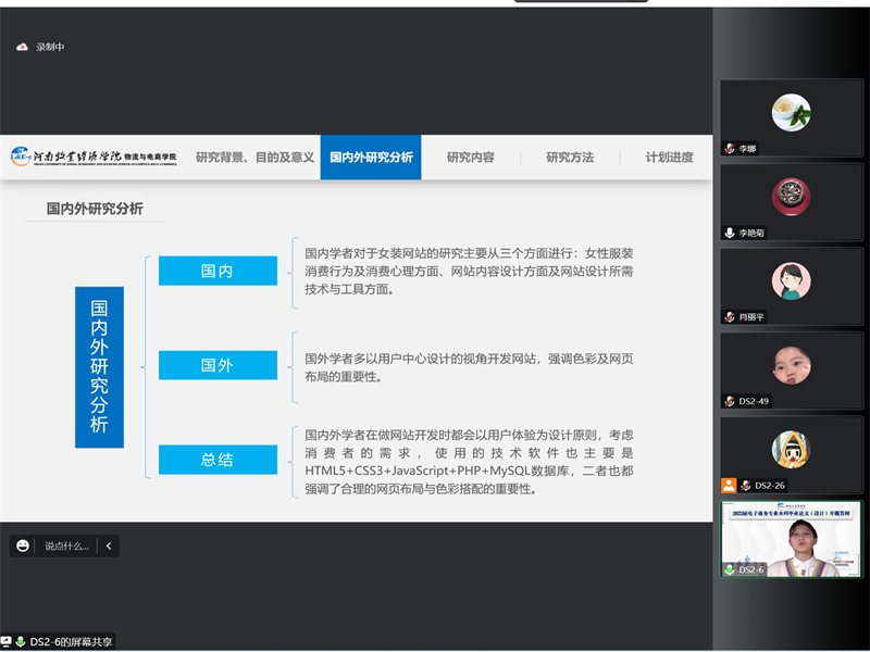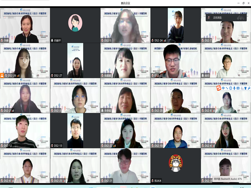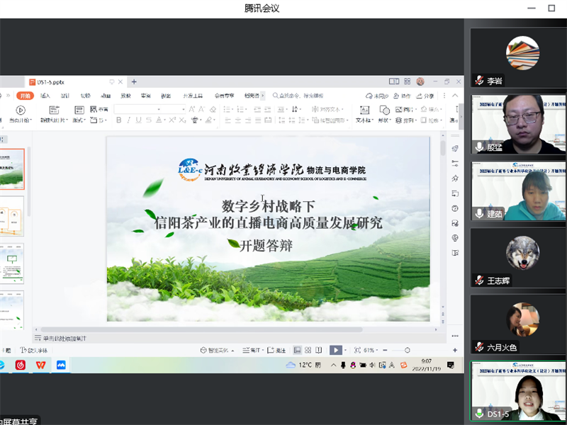 2022年11月19日,物流与电商公司通过腾讯会议举行了2023届电子商务本科专业毕业论文(设计)开题答辩,本次答辩会共计110名本科毕业生,分两个小组进行答辩。答辩小组组长分别由电子商务教研室主任殷猛博士、电子商务实验室主任肖丽平博士担任。