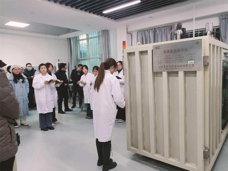 年轻的郭依舒老师带领一众老师及员工在冷链预冷实验室开展果蔬真空预冷实验教学。针对果蔬真空预冷机进行生动的讲解并穿插实际操作,通过具体的实验技巧和方法演示果蔬真空预冷机如何使用及果蔬如何进行真空预冷,引发老师和同学们的激烈讨论。实验教学和研究讨论的有序开展将更有利于冷链人才培养及实践教学活动的创新。