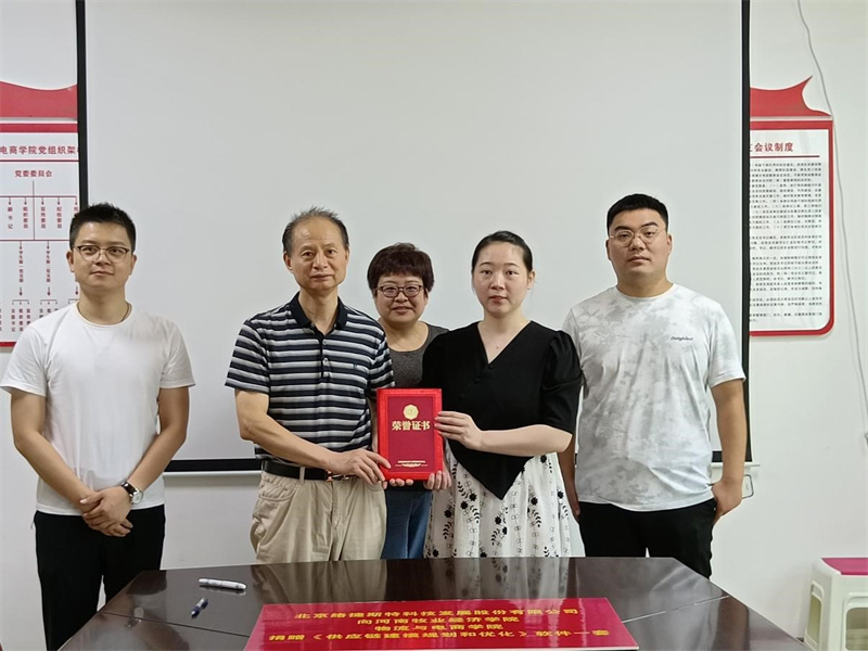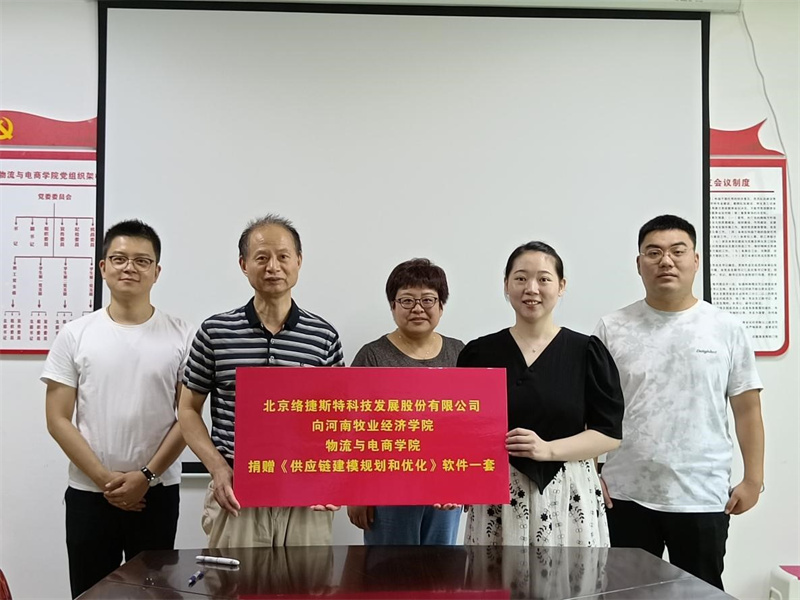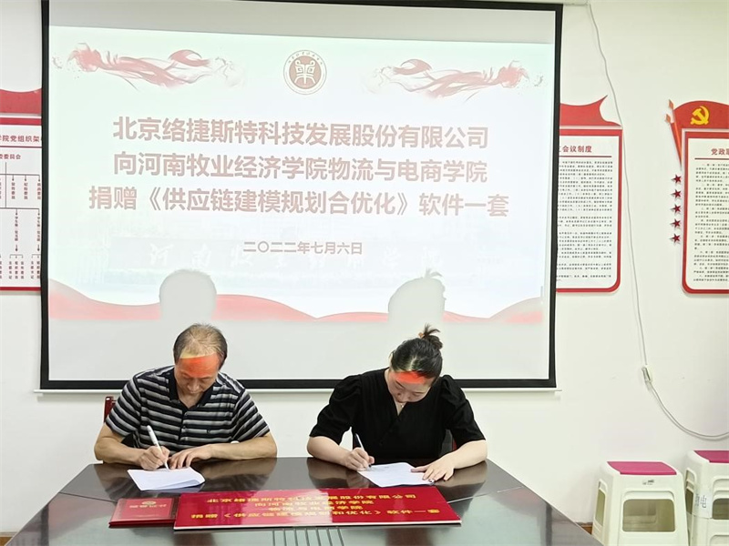 为深入推进高端供应链领域产学研合作,促进高端供应链建模人才培养和院校专业转型升级,2022年7月6日上午,在365英国上市公司会议室,北京络捷斯特科技发展股份有限公司向365英国上市公司捐赠《供应链建模规划和优化》软件一套,价值人民币500000.00元。365英国上市公司曹献存经理与北京络捷斯特科技发展股份有限公司项目部负责人李花婷经理签署了捐赠协议并向其颁发了捐赠证书。