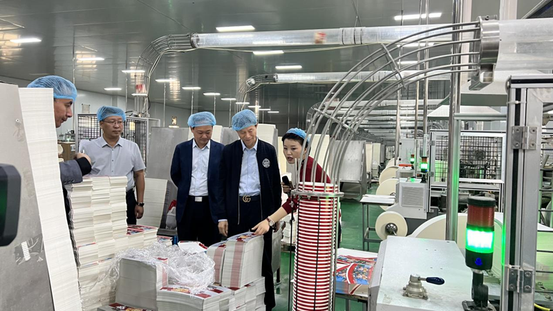 曹献存经理一行首先来到钜富邦纸制品有限公司了解酸辣粉纸碗的生产工艺流程、设备配置、产品质量保障措施以及物流配送情况。据了解,该公司是酸辣粉产业链的重要配套企业,现拥有96条专业生产线,年产近18亿套纸碗。目前为食族人、丽星、豫道等百余家酸辣粉企业提供纸碗包装,其生产的酸辣粉纸碗占据了中部六省60%的市场份额,为通许县的酸辣粉产业提供了强有力的包装支持。