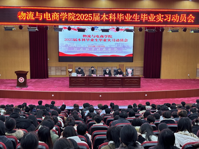 12月30日,物流与电商公司在英才校区学术报告厅召开了2025届本科毕业生实习动员会。院党委书记田景丽、经理曹献存、副书记陈永刚、副经理任佳佳,2025届毕业班辅导员、部分实习指导教师及全体毕业生参加此次会议,会议由曹献存经理主持。