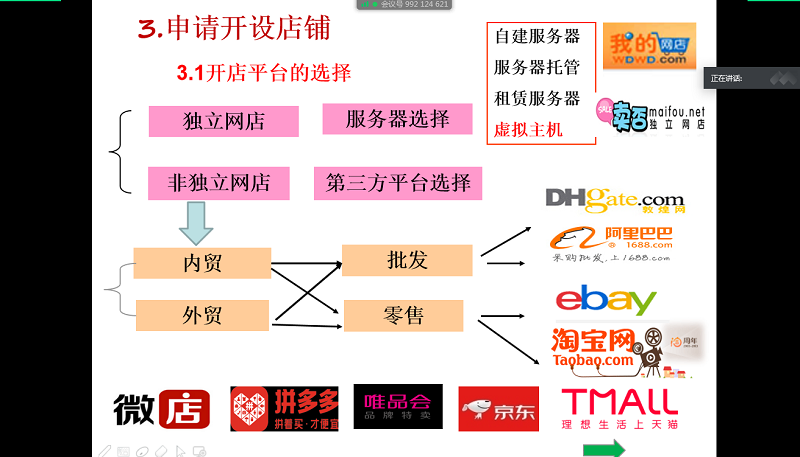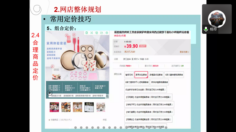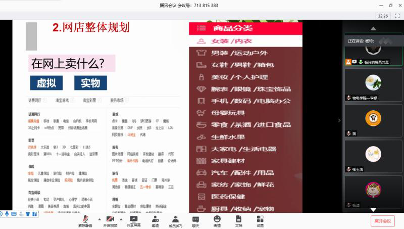 杨玲老师精心准备了此次观摩课,将课程思政、教学方法及多媒体教学手段与教学实际有机融合,在课堂上以网上开店作为主任务启发员工思维、培养员工学习兴趣,同时融入创业创新理念,让听课的师生充分感受到了教师扎实的专业知识、周密的课堂设计以及高超的课堂驾驭的能力。在线课堂上,杨玲将I博导和腾讯会议在线教学工具巧妙结合,通过图文并茂的课件、形象生动的讲解、准确精彩的示范,从网上开店的基础流程入手,系统地讲授了“开店前的准备”、“网店整体规划”、“选择网销商品”、“选择合适平台”、“申请开设店铺”等教学内容。