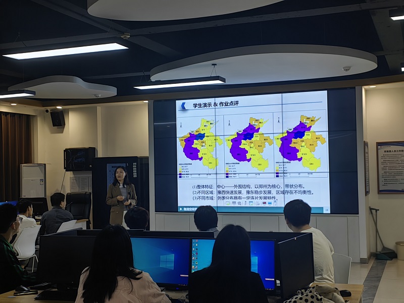 本次示范课的授课对象为20物流01班的同学。首先是课前回顾环节:先由员工进行作业演示,随后张老师对作业进行了点评;然后是精讲环节:通过前测了解员工自学情况,明确了教学目标,由计算人口密度问题引入本节课关于核密度法的概念,并对做核密度图可能出现的问题进行梳理;最后是小组讨论环节:围绕河南省冷库分布问题,探讨存在哪些分布特征、现有知识可以解决哪些问题、核密度需要哪些数据、如何实现等内容,小组进行总结并开展课堂讨论。