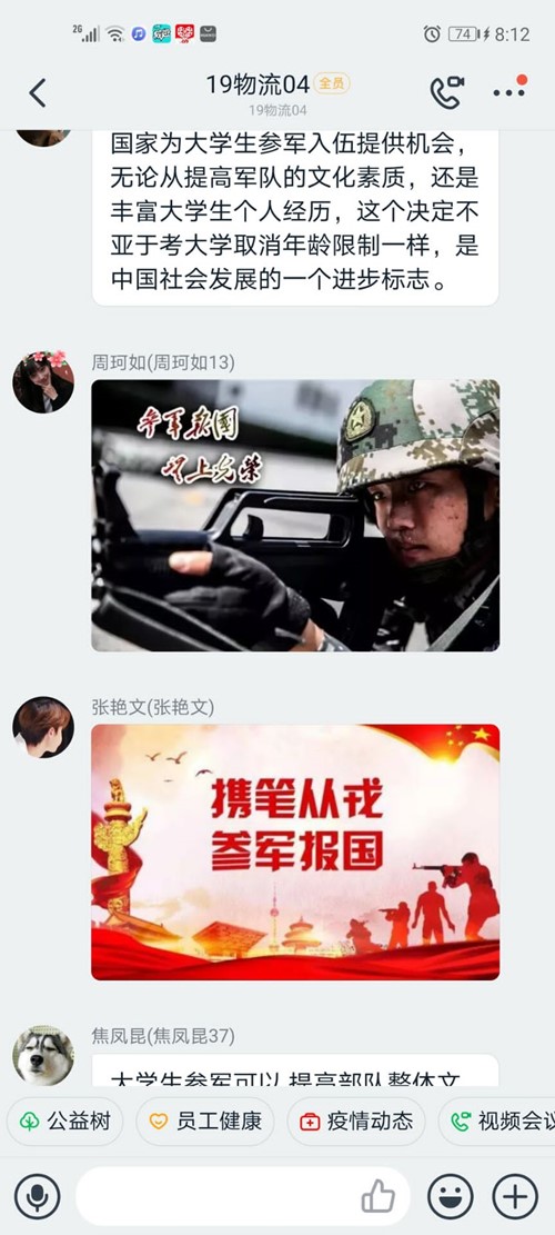 为带领公司员工学习2020年老员工参军政策,培养员工参军报国的意识,6月11日晚上7:30,365英国上市公司各班团支书组织本班人员在各自钉钉群内举办以“参军报国,逐梦青春”为主题的团课活动。