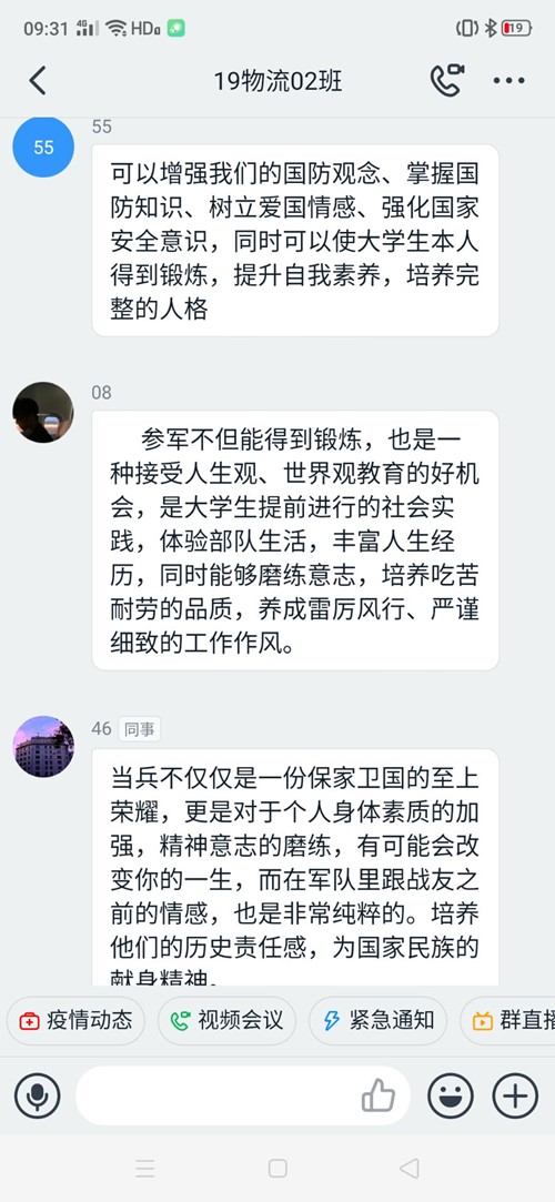 首先,各班主持人展示了2020年老员工参军的相关政策,让大家了解国家对老员工参军的需求。《宪法》规定:“保卫祖国、抵抗侵略是中华人民共和国每一个公民的神圣职责。依照法律服兵役和参加民兵组织是中华人民共和国公民的光荣义务。”接着,主持人为大家播放了许多央视的光荣军人视频,让大家了解到身为中国军人需承担的责任、使命以及光荣。随后,主持人让同学们就观看的政策截图和视频展开讨论。大家一致认为:“颜值的青春在军营,升值的年华在报国。”随着时代的前进,科技和知识的较量最终体现为人才的较量,而高校老员工就是高技术人才队伍的主体。大学入伍是国防现代化建设的需要,是高素质兵源成为军队建设的迫切需要。