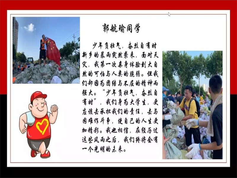 首先,由本期主持人向大家介绍此次读书沙龙活动的主题:抗洪抗疫志愿者分享心得。暑期已过,本应开学的日子转战线上课堂,河南迎来了最不平凡的一年,先是前所未有的洪灾,后有突如其来的新冠疫情。会议由此进入主题,抗洪抗疫分享者都打开了摄像头,按照顺序依次分享自己在参与志愿者活动中的心得。他们有的身临洪区,有的进入抗疫战斗的后卫军,都在志愿者队伍中发挥自己的巨大作用。通过大家的回忆和陈述,可以看出分享者切实为社会奉献,为人民服务的态度。志愿者分享结束,主持人又向观众发问,观众通过向会议连麦,说出了自己听过志愿者分享后的感受。