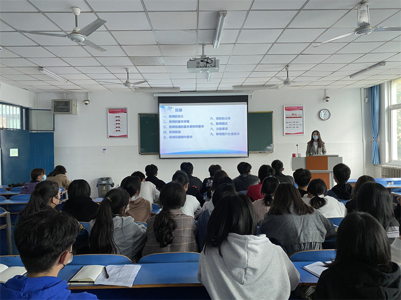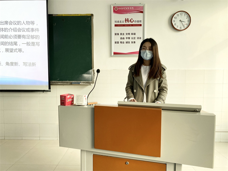 本次新闻稿培训会上,杨雪老师从新闻的定义、新闻的基本体裁、新闻报道的基本原则和要求、新闻框架、新闻标题制作要求、消息的主体、新闻模式、注意事项、新闻图片处理要求这九个方面依次向同学们讲述新闻的写作要求。由定义开讲,层次分明、逐步升华、覆盖全面。杨雪老师精彩地解说,结合PPT的详细展示使同学们对新闻稿的写作有了一个更加全面地了解和认识。随后,融媒体中心干事石佳瑶和秦羽珂上台为同学们分享了新闻稿写作需注意的事项,为同学们指点迷津。最后,本次新闻培训会在同学们热烈的掌声中结束。