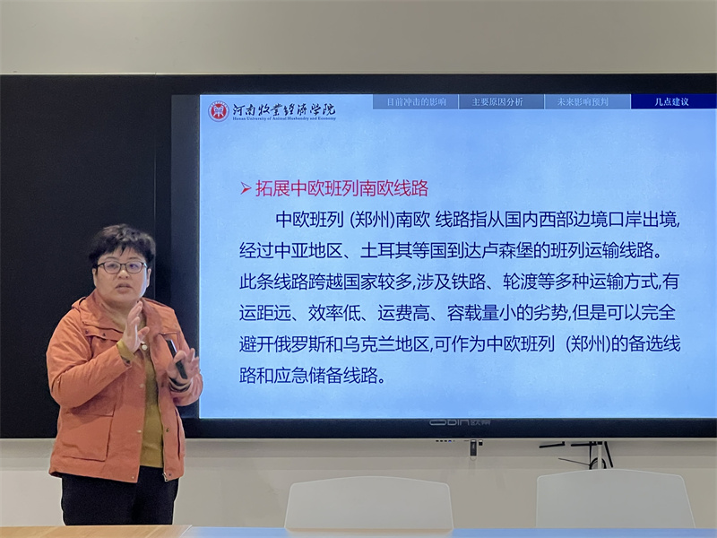 活动伊始,孙博士从俄乌战争的发展现状作为切入点,讲到俄乌战争给世界带来最直观的影响就是油价、物价的上涨。之后,孙博士通过欧盟切断对俄SWIFT支付平台事件,分析了俄乌战争所带来的经济影响以及对河南物流业所带来的影响,主要有以下三点:一、省内国际物流订单量出现明显下降;二、国际物流的交易成本明显上升;三、郑欧班列运输价格竞争加剧。这就可能导致国际货运需求量将进一步下降,同时中欧班列部分线路可能会有阻断风险。基于以上影响,孙博士提出可以从拓展中欧班列南欧线路、支持海铁联运班列开行、拓展跨境电商国外市场三方面作出应对。