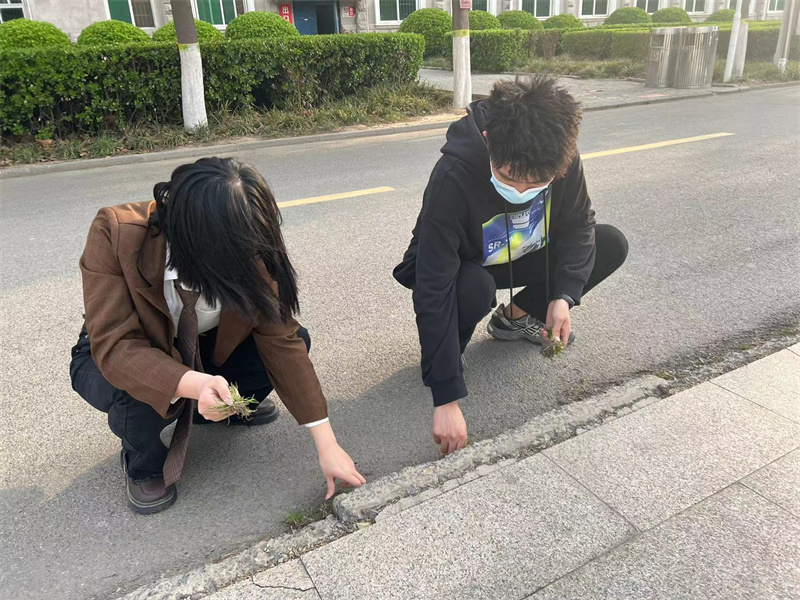 清扫前,员工们在领取各自劳动工具后,迅速到达指定劳动区域进行明确分工而后开始清扫活动。虽已至三月,但冬日的寒气并未散去,但这丝毫不影响员工们积极清扫的热情。员工们在打扫卫生的时候注意到路沿处的野草不利于道路美观,秉持着“致广大而尽精微”的成事之道,主动将野草进行处理清扫,虽没有除草工具,但同学们或拔或割,终将野草处理地干干净净。彰显了物电学子一丝不苟的劳动态度与奋勇当先的青春担当。在清扫的过程中,陈永刚书记和夏静老师来到劳动区域与员工们进行交流讨论,员工们表示从劳动中收获了快乐,更加明白了劳动的意义。偶尔经过的教职工也对员工们认真清扫的态度连连称赞,更增加了员工们劳动的成就感。