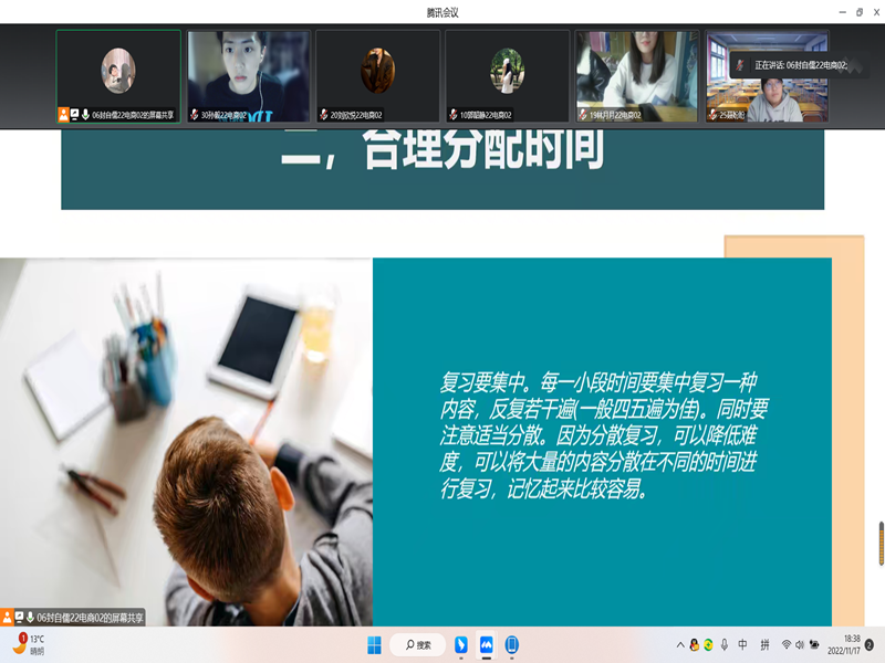 团课伊始,团支书首先提出了当下员工网课学习的现状及临近期末考试员工压力大等问题,由此引出本次团课目的,针对这些问题,同学们积极进行讨论,并分享了自己的经验。同学们根据自己的经验为期末复习给大家提出了不同的建议:对于思政类课程,在复习备考阶段,利用每天的零碎时间进行背诵,不仅能实现时间的高效利用,更能加深理解、巩固记忆;对于英语课程,熟练掌握课件中的概念是复习的重点,在时间充裕的情况下,整理出一份自己的复习笔记,是串联知识点和巩固记忆的好方法;对于数学类课程,通过多加练习提升熟练度是一个有效的方法,做题的时候,要带有自己的思考,不要过分依赖答案;对于专业课程,除了参考老师提供的课件,还可以自行上网搜索相关领域的学习资料;对于专业性比较强、在网络上参考资料较少的课程,可以查找与之相近学科的资料作为补充。在团课最后,学委宣布成立“学习互助小组”来有效化解团员青年学业困难,团支书号召全体同学积极参与,分享学习经验。此外,班长号召各宿舍团小组充分发挥组织功能,积极营造宿舍优良学习环境、和谐互助氛围,发挥带头模范作用,互帮互组共同进步。