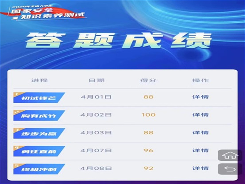 员工通过微信公众号,在4月1日–4月3日、4月7日–4月8日进行线上答题。题目涉及的法律法规包括国家安全法、国防法、反分裂国家法、反间谍法、反恐怖主义法、数据安全法、生物安全法、网络安全法、刑法关于危害国家安全犯罪的规定等。此次答题活动充分调动了员工的积极性和主动性,把国家安全知识素养测试活动与“4·15”全民国家安全教育结合起来,让员工在活动中提升国家安全意识,掌握国家安全知识,自觉维护国家安全。
