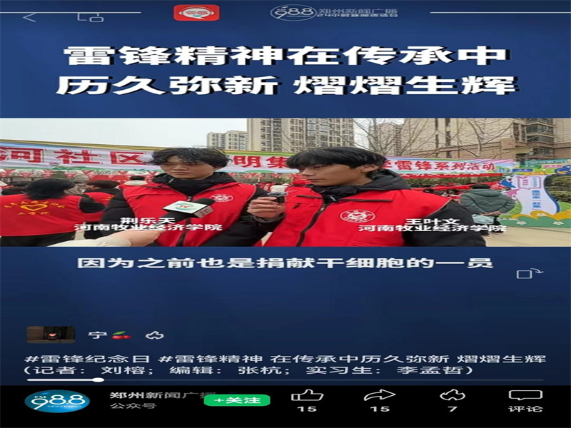 在公司党委宣传部的关心指导下,经过前期与惠济区文明办的联系沟通,荆乐天和王叶文两位同学认真准备,在活动现场,他们与惠济区天河社区、惠济区志愿互助服务中心、大河路街道办事处、郑州惠济区神鹰救援队等众多学雷锋参与者们一起,认真完成各项主题活动环节。按照活动流程安排,荆乐天和王叶文与其他三名志愿者一起登上讲台,庄重而深情地为大家重读《雷锋日记》(节选),通过慷慨激昂的朗诵,向与会全体观众重温雷锋精神,引领大家感受雷锋精神的丰富内涵和时代价值,充分展示了新时代青年学子弘扬雷锋精神的责任担当。荆乐天和王叶文两位同学,有多次无偿献血、积极参加志愿服务活动的经历,通过捐献非血缘关系造血干细胞的义举,传递了大爱,是学习传承雷锋精神的践行者。活动结束后,两位同学接受了郑州广播电视台的采访,他们对雷锋精神的理解、实践以及如何宣扬雷锋精神等认真作了一一回答。