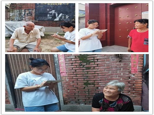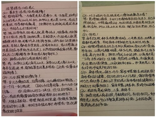 活动伊始,崔涵同学首先对周边留守老人的情况进行了大概的调查并记录了老人情况。十八日上午,崔涵同学对几位老人进行了采访交流,采访内容围绕着老人们的基本生活、政府补贴、子女照顾等方面展开。她了解到几位老人的子女都在市里工作、居住,老人们之所以选择留在老家一方面是不愿意麻烦子女,另一方面是不适应城里的生活方式。他们觉得老家的生活很悠闲,而且对于60岁以上的老人,政府每个月都有补贴,加上子女每个月回来探望,他们的基本生活还是能够得到保证。镇上的卫生院每年都会组织老人进行免费的全方面体检,即使老人生病了,医保卡也能为他们省去大部分的花销。“我和其他老人聊天的时候经常说现在的生活比以前好了太多,衣食住行都能体现出来,这些和共产党的领导是离不开的。”一位老人说。
