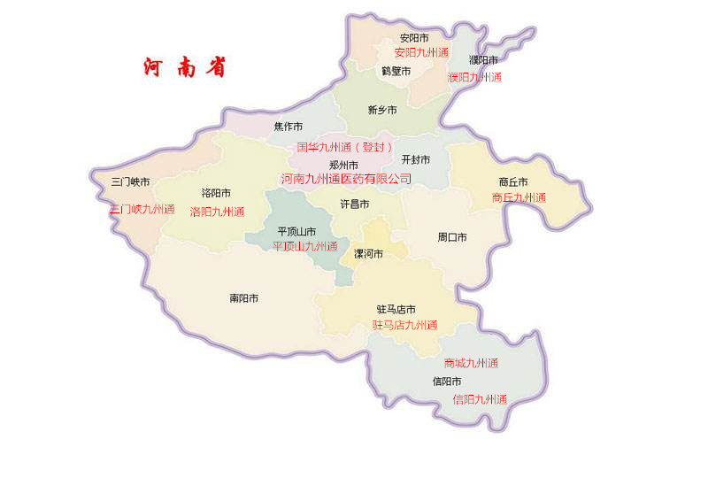 公司以郑州为中心,营销和配送网络已覆盖河南省大部分地区,设立了商丘九州通、三门峡九州通、信阳九州通、濮阳九州通、安阳九州通、平顶山九州通、洛阳九州通、驻马店九州通、商城金康九州通、国华九州通、河南九州通物流有限公司、河南九州通医疗器械有限公司等分公司。拥有大小车辆97台,配送深入108个县,实行全天候的物流配送服务,现有商业客户400余家、连锁客户300余家、终端客户10000余家、医院客户2000余家。2016年,公司整体完成销售额75亿元(含税),缴税1亿多元。